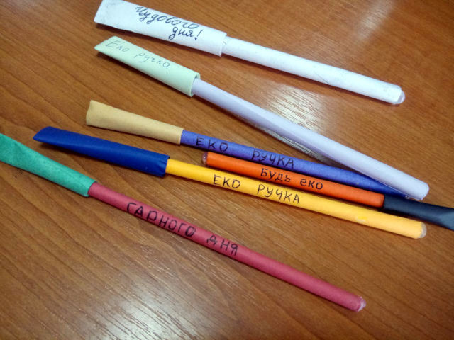 Для еко-ручок школярі беруть використані роздруківки, залишки кольорового паперу та стержні. Роблять на виховних годинах або під час великих перерв.