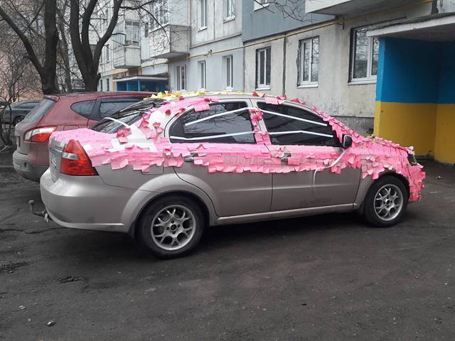 У районі вулиці Жадова в обласному центрі невідомі обклеїли припарковану автівку рожевими, жовтими і зеленими канцелярськими стікерами.