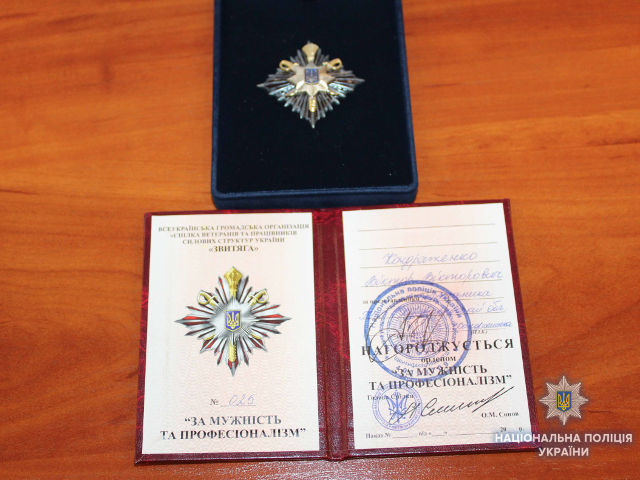 У присутності особового складу очільник поліції області полковник Кондрашенко подякував Віктору Кондратенку за його героїчний вчинок та вручив заслужену нагороду.