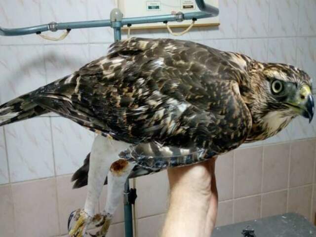 Чоловік привіз птаха до ветклініки. Лікарі під час огляду виявили в нього переломи обох лап. Що призвело до таких травм - невідомо. Соколу надали допомогу - наклали гіпс.