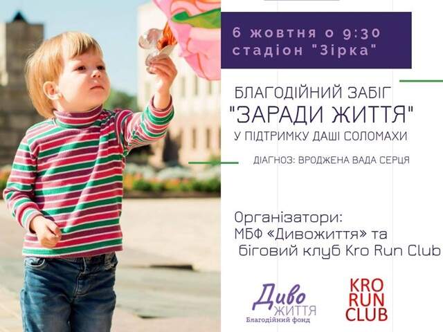 Мета акції - допомогти зібрати кошти на операцію на серці маленькій Даші Соломасі. Вартість участі в благодійному заході – 50 гривень. Відстань забігу – один кілометр.