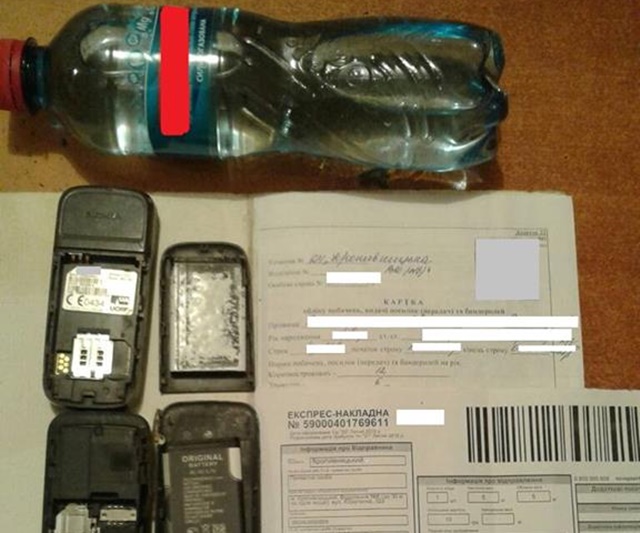Мобільні телефони приховали у коробці під пакетиками чаю, а заборонену рідину виявили у пластиковій пляшці з мінеральної води місткістю півлітра.