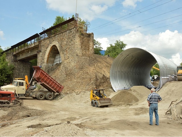 Будiвельники вже встановили змонтовану гофровану трубу – тiло майбутнього арочного проїзду на своє мiсце i укрiпили його основу бетоном. Сьогоднi триває заповнення простору мiж стiнами труби i залiзничним насипом пiщано-щебеневою сумiшшю, її ущiльнення i трамбування. У самiй трубi ведуть пiдготовчi роботи з облаштування там асфальтового покриття та встановлюють арматуру для залиття бетоном опорних стiнок.