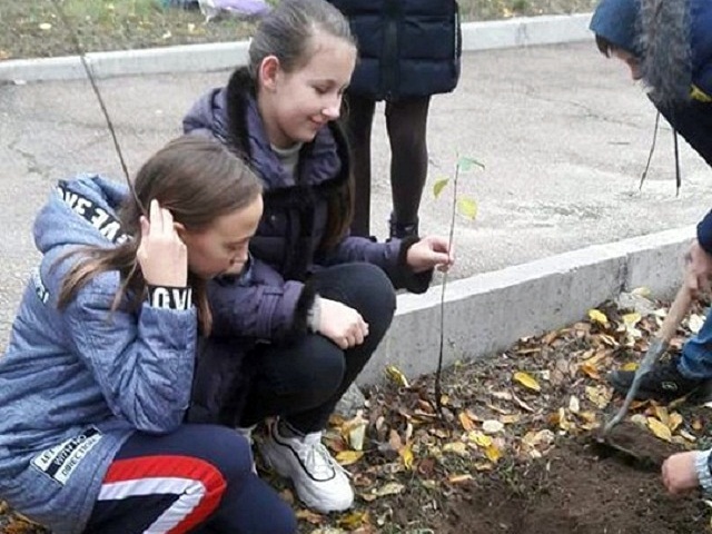Учні шостого класу висадили біля школи чорні тополі. Ці дерева найбільше поглинають вуглекислий газ (до 40 кг за літо), очищають повітря від пилу та шкідливих викидів.