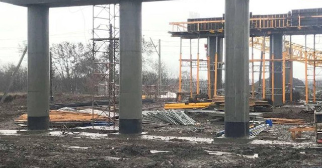 На шляхопроводі у Знам’янці Другій практично всі стійки цементобетоном уже залили, ремонтники влаштовують ригелі. Тут уже вмонтували сім балок.