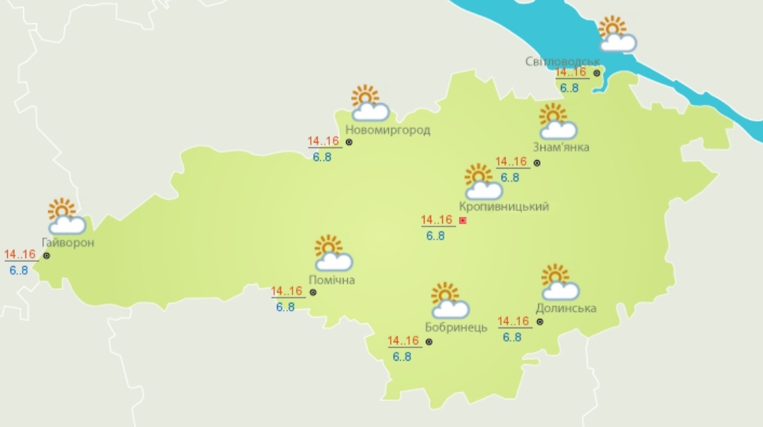 Вдень, 22 вересня, на Кіровоградщині температура повітря очікується від 14 до 16 градусів тепла. Без істотних опадів. Вітер північно-західний, 5-10 м/с.
