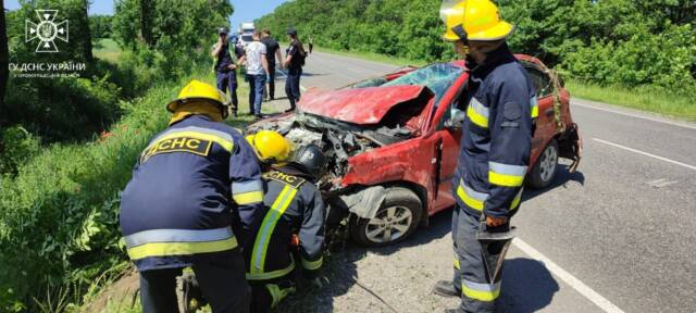 Рятувальники доправили жінку до автомобіля екстреної медичної допомоги та деблокували тіло загиблого чоловіка з пошкодженого автомобіля.