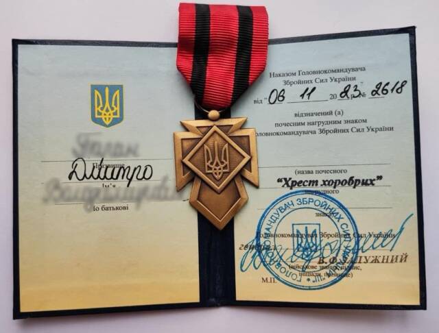 Військового Дмитра, родом з села Соколівське, нагородили нагрудним знаком «Хрест хоробрих» від Головнокомандувача Збройних сил України Валерія Залужного.