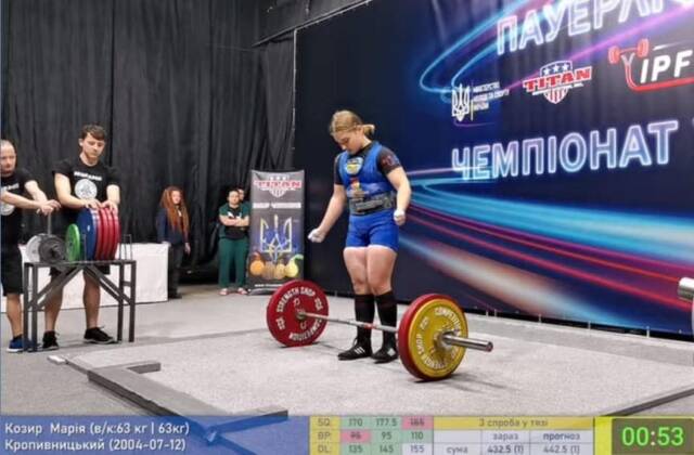Козир Марія у ваговій категорії до 63 кг у сумі триборства зайняла 1 місце. І по вправах: присідання 1 місце, жим 1 місце, тяга 1 місце. Друге місце Софія Бдзир з Тернополя