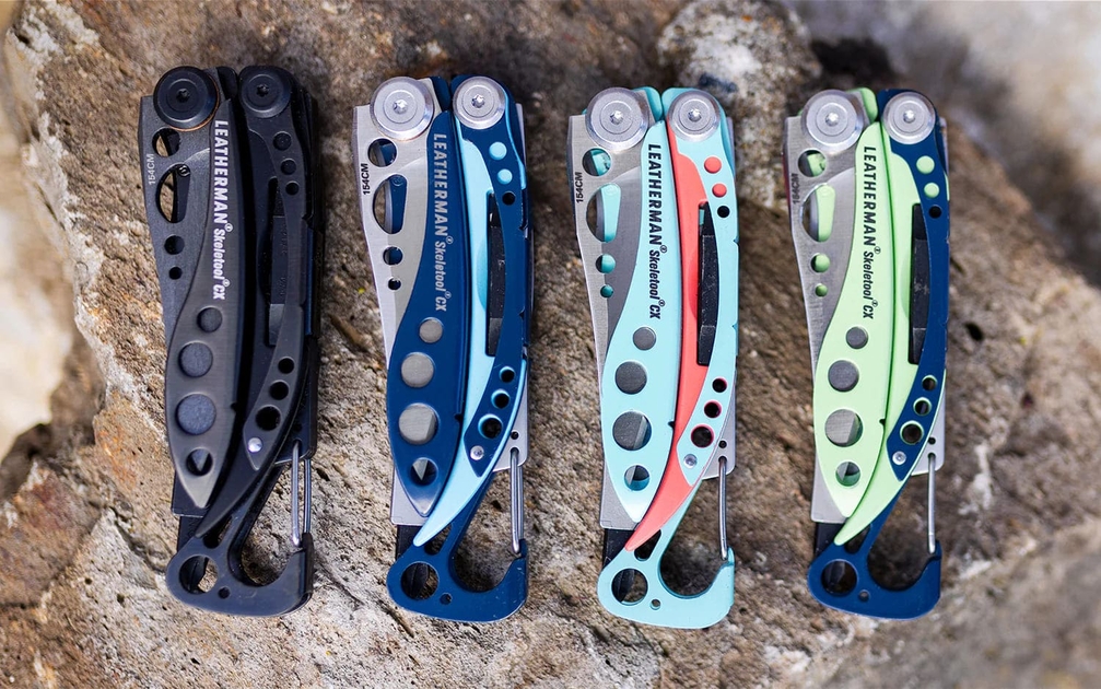 Якщо нові кольори Мікра пропонували класичні відтінки (сірий, приглушений червоний і класичний темно-синій), то Скелетул виділяється зовсім іншими варіантами. Вони відходять від традиційного стилю Лезерман. Модель Skeletool CX тепер доступна у кольорах Onyx (ідеальний чорний для любителів нейтральних відтінків), Nightshade, Verdant та Paradise. Всі ці кольори відносяться до синьої, зеленої та блакитної палітри. Тут немає пурпурових, неонових або яскраво-жовтогарячих відтінків, що є незвичним вибором для мультитулів Лезерман. Незважаючи на зміни в колірній гамі, функціональність цього повнорозмірного мультитула залишається колишньою. Він оснащений фіксованим лезом зі сталі 154CM, карабіном, відкривалкою для пляшок, двома кусачками, двома плоскогубцями та бітотримачем.