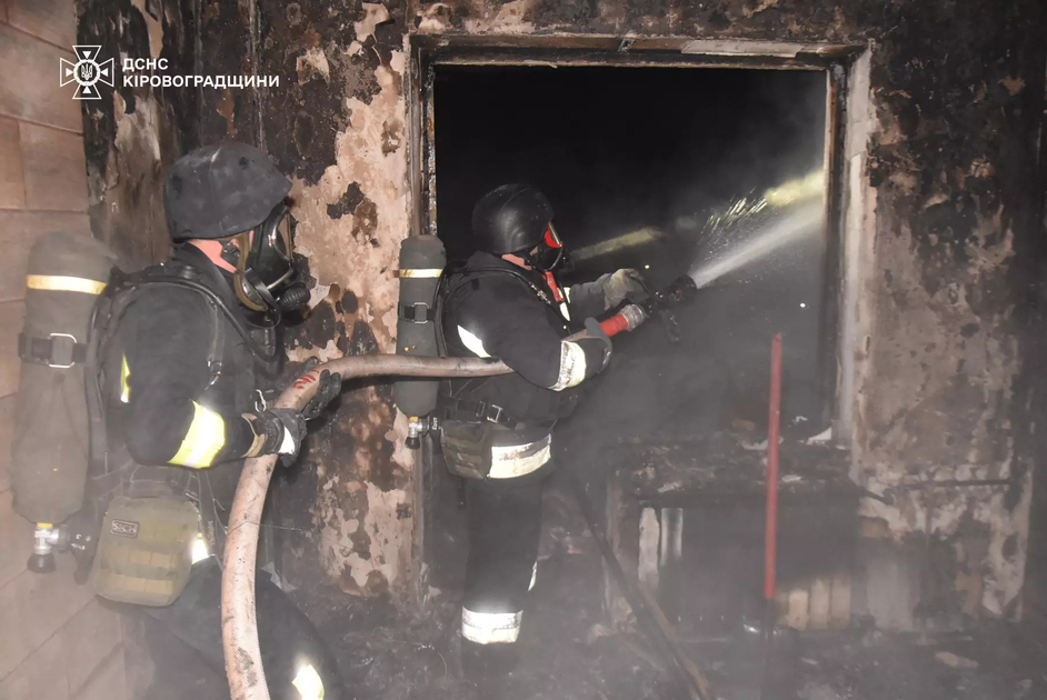 Головне управління ДСНС України у Кіровоградській області повідомило, що опівночі Служба порятунку гасила пожежу після влучання ворожого БпЛА. Загорілися дві квартири. О 2:59 займання ліквідували рятувальники. Пожежу гасили 23 рятувальники.