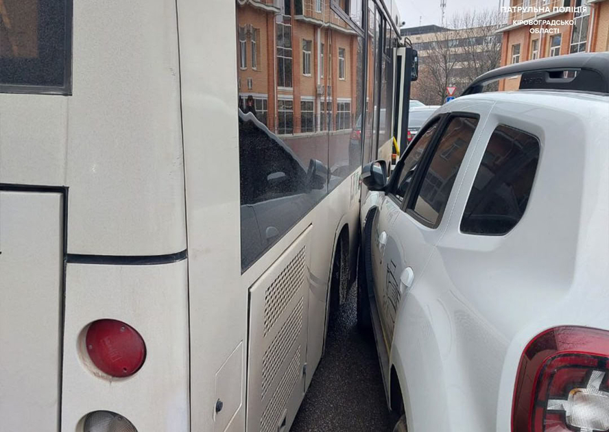 У Кропивницькому водій комунального автобуса врізався у припаркований автомобіль Renault Duster.