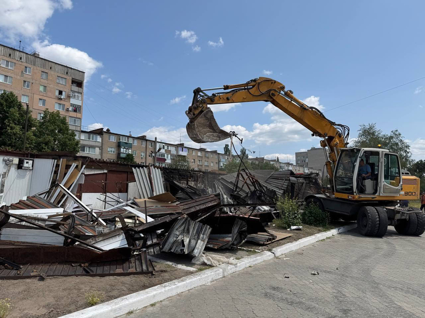 Тут демонтують старі металеві кіоски, вагончики та цегляні будівлі, які залишилися після завершення дії оренди приватного підприємця ще два роки тому. Попри численні попередження, тимчасові споруди не прибирали, тому міська рада звернулась до суду.